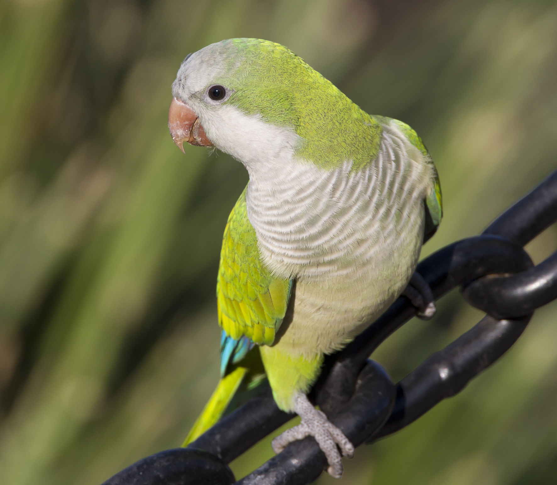 Perico monje: El primer nombre de loros que hablan, también es conocido como cotorra argentina. Este colorido pajarito se considera como uno de los loros más pequeños en ser domesticado. Estas aves son conocidas por ser muy inteligentes y sociales, llegando a desarrollar un gran vocabulario de palabras y frases.